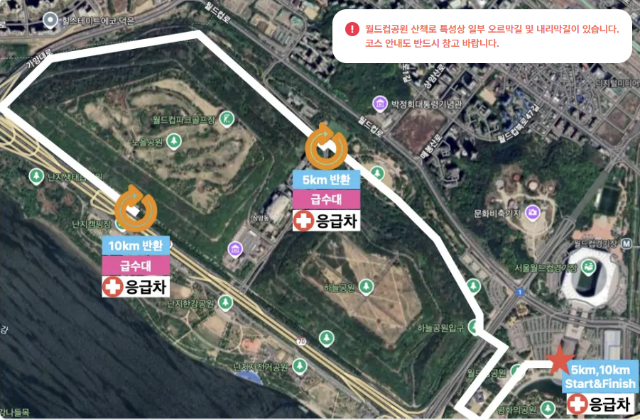 5km 코스는 평화광장에서 출발하여 난지생태광장을 거쳐 하늘공원 입구까지 왕복하는 루트로, 100% 평탄한 포장로로 구성되어 있어 초보자도 편안하게 참여할 수 있습니다.